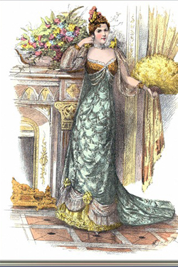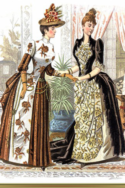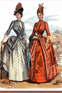 Стремление к особой утонченности и изяществу заставило служителей моды затянуть женщину в еще более узкий и высокий корсет, который начинался под грудью и заканчивался на середине бедра. А устраненную таким образом естественную пышность бедер компенсировали за счет модной детали – турнюра, который украшали лентами и бахромой.