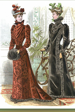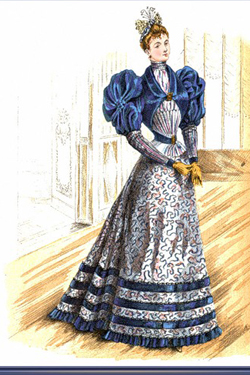 Дамские туалеты становятся подчеркнуто женственными. В моду входит силуэт «песочные часы». Пышные, сложные рукава, тонкая, «осиная» талия и огромная, длинная юбка, напоминающая колокол. Столь замысловатую конструкцию даже сложно было назвать платьем. Еще труднее было обеспечить надлежащий уход за таким туалетом. Да и двигаться в нем было весьма затруднительно. Не говоря уж о том, что такой фасон красил далеко не каждую женщину. Но дамы вместе с умельцами-портными нашли выход из положения. Жизнь платью (которое, учитывая сложность исполнения, недешево стоило) продлевало хорошее качество ткани и сдержанные (читай: немаркие) цвета. А чтобы образ не получился удручающе тусклым, модницы освежали его белоснежными воротничками и манжетами, умело дополняя украшениями.