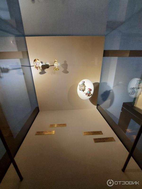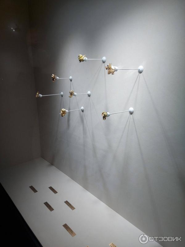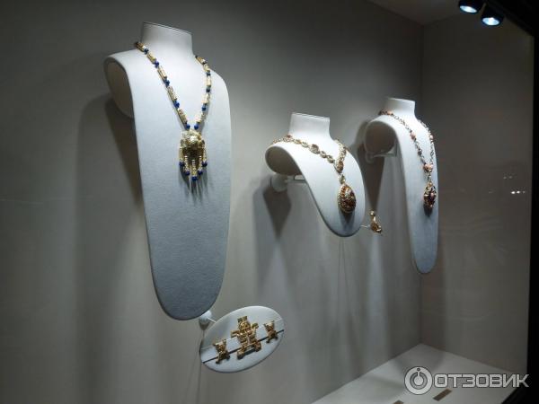 Все экспонаты были помещены в стеклянные боксы, с идеальным освещением, которое идеально подчеркивало красоту и блеск этих изделий, в помещении было мало освещения, чтобы посетители могли хорошо рассмотреть все украшения. Возле каждого из них есть табличка, в которой указано материал из которого изготовлен предмет.