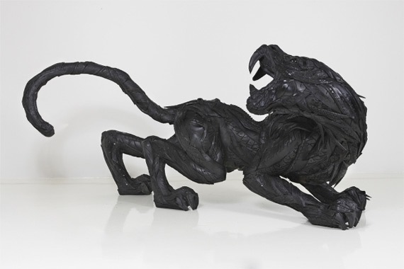 Чтобы выразить напряжение мышц, скульптор использует изношенные шины, а текстуру кожи и меха умело имитирует сложным узором из протекторов, фактурность которых придаёт дополнительную декоративность готовой скульптуре.
