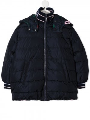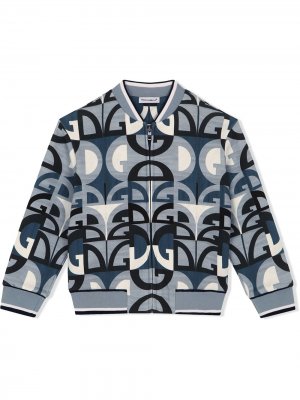 Сплошной принт с логотипом, воротник-стойка, застежка на молнии спереди и длинные рукава. Цвет: синий.