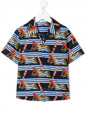 Графический принт, заостренный воротник, V-образная горловина, короткие рукава, накладной карман на груди, прямой подол и застежка на пуговицах спереди.