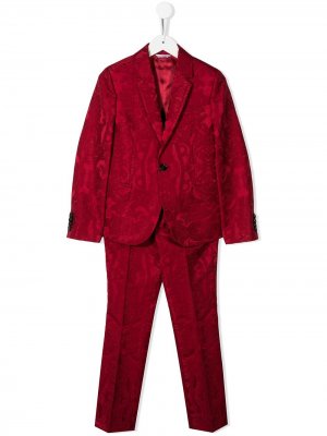 Зазубренные лацканы, застежка на пуговицах спереди, передние карманы с клапанами, длинные рукава, манжеты на пуговицах, прямые брючины и складки. Цвет: красный.