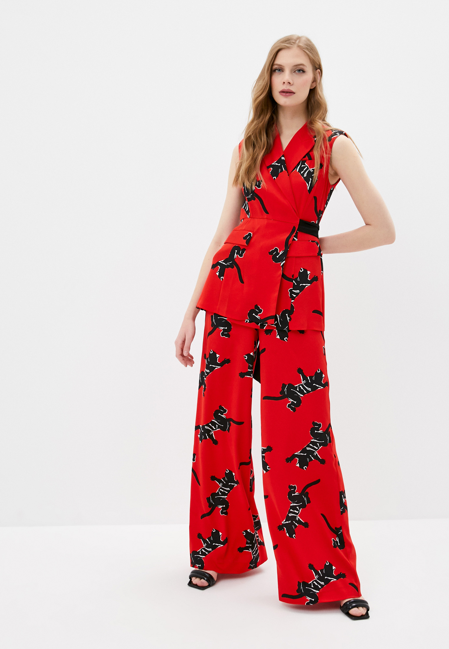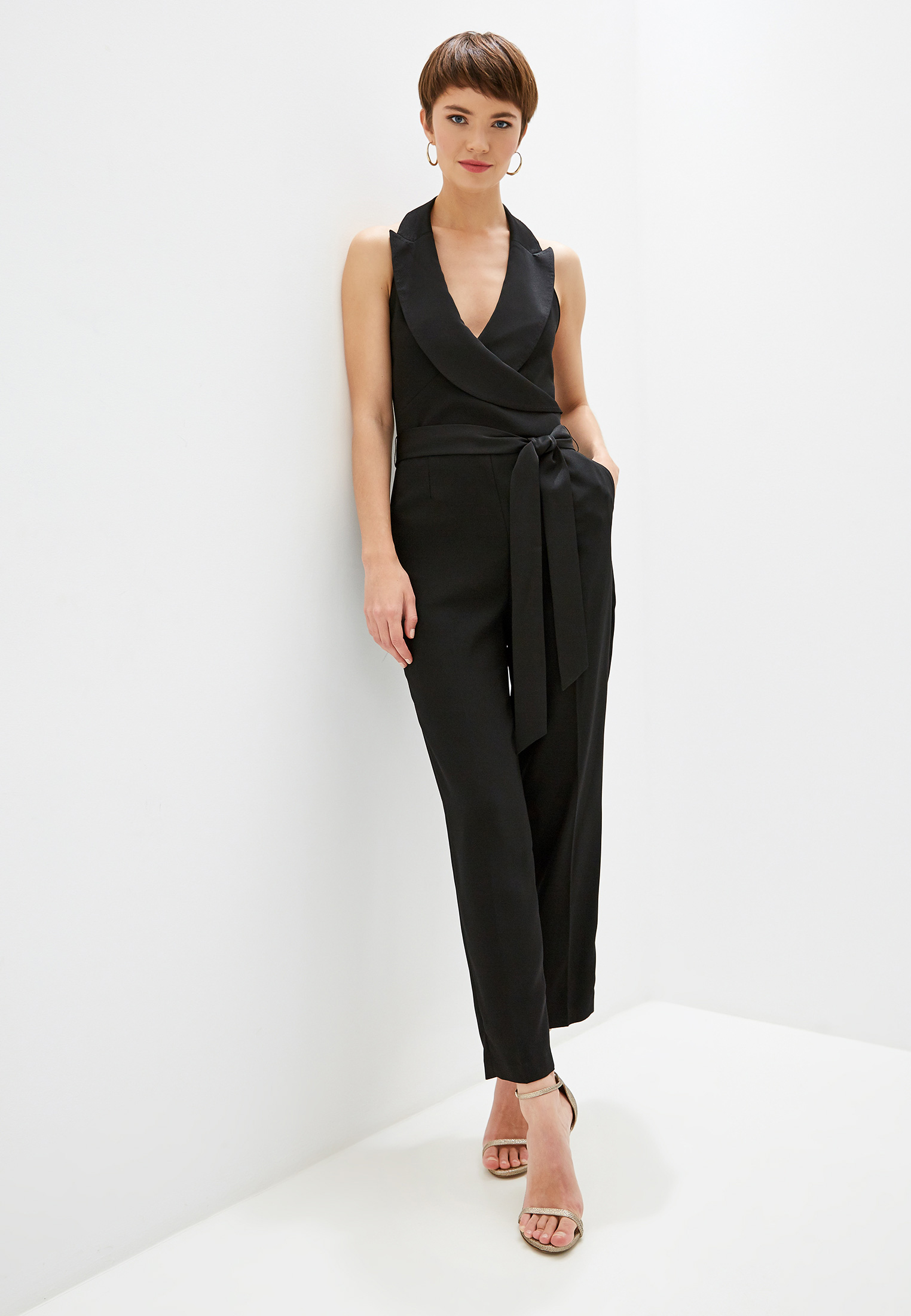 Черный комбинезон из осенне-зимней коллекции 2019 года отлично справится с ролью коктейльного платья. Останется только взять в руки клатч и встать на каблуки. Стрелки у изделия из тонкого креп-сатина визуально.
