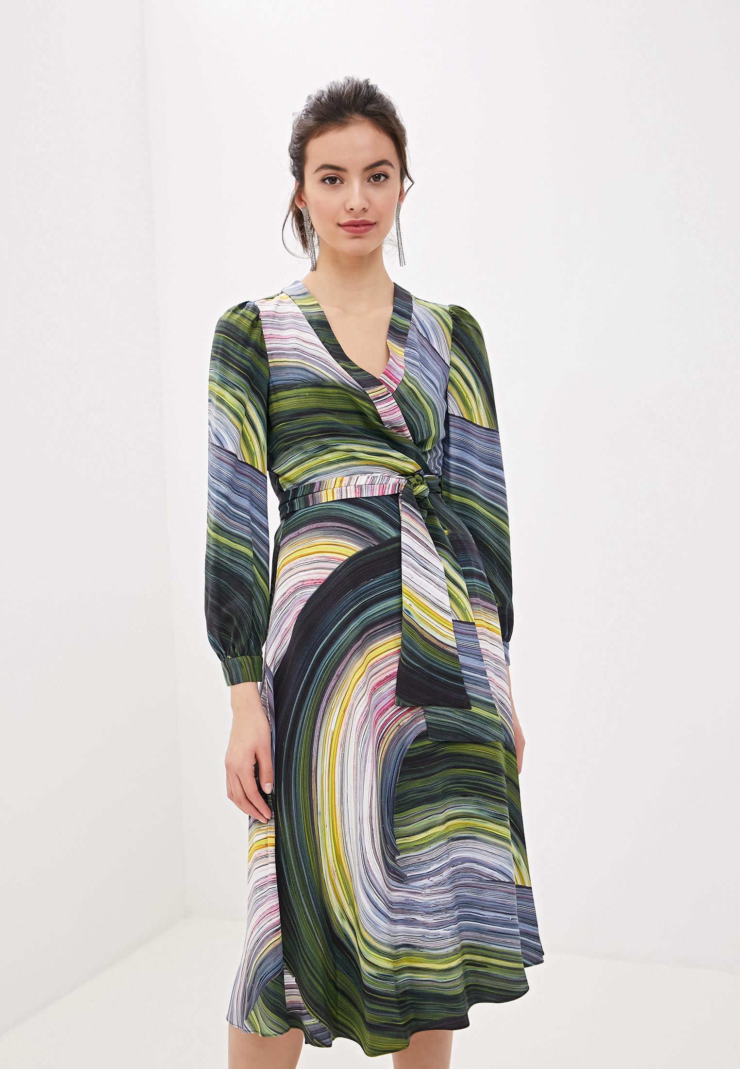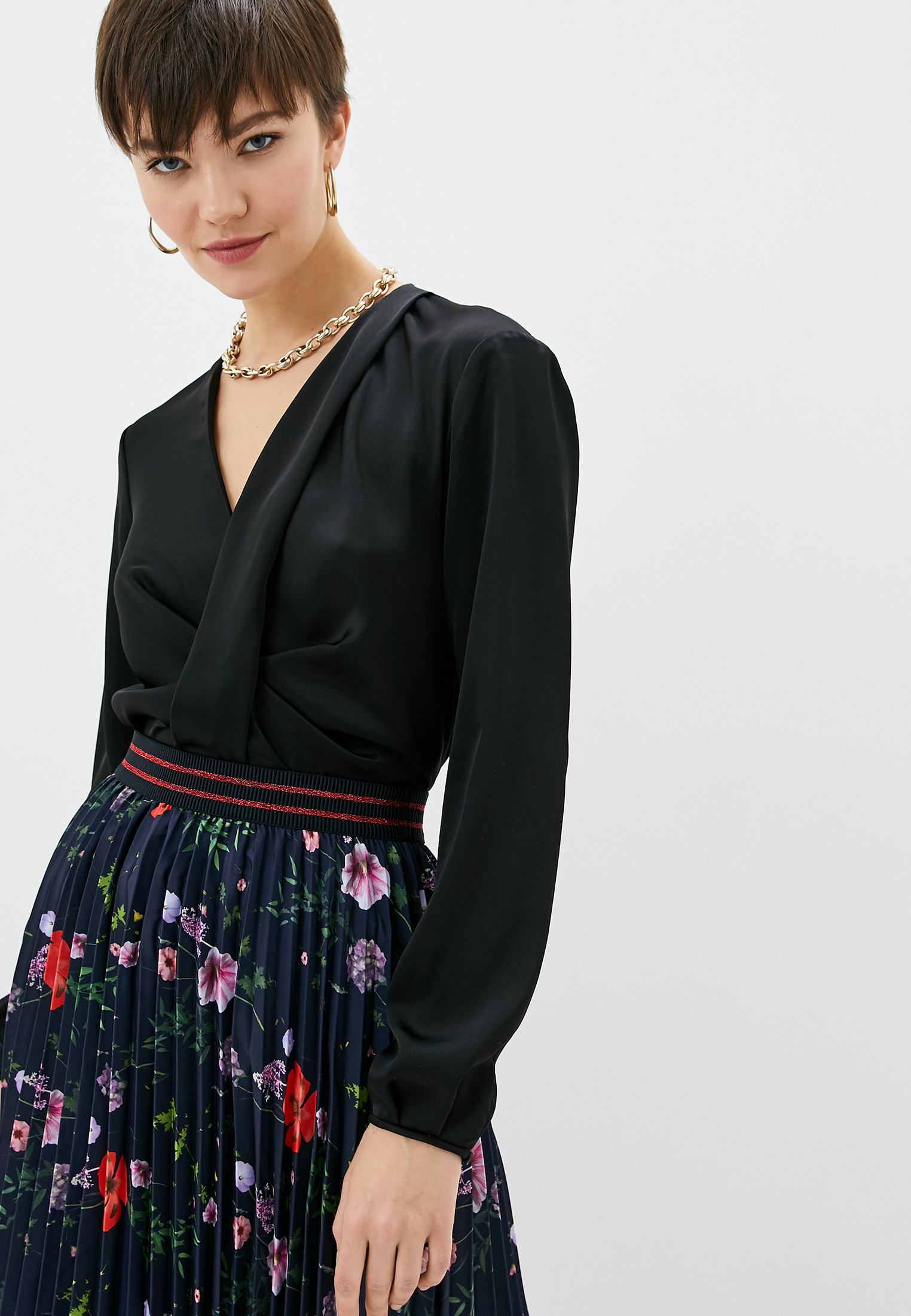 Сплошной цветочный принт, контрастные вставки, V-образный вырез, длинные рукава, юбка с запахом и завязки спереди.