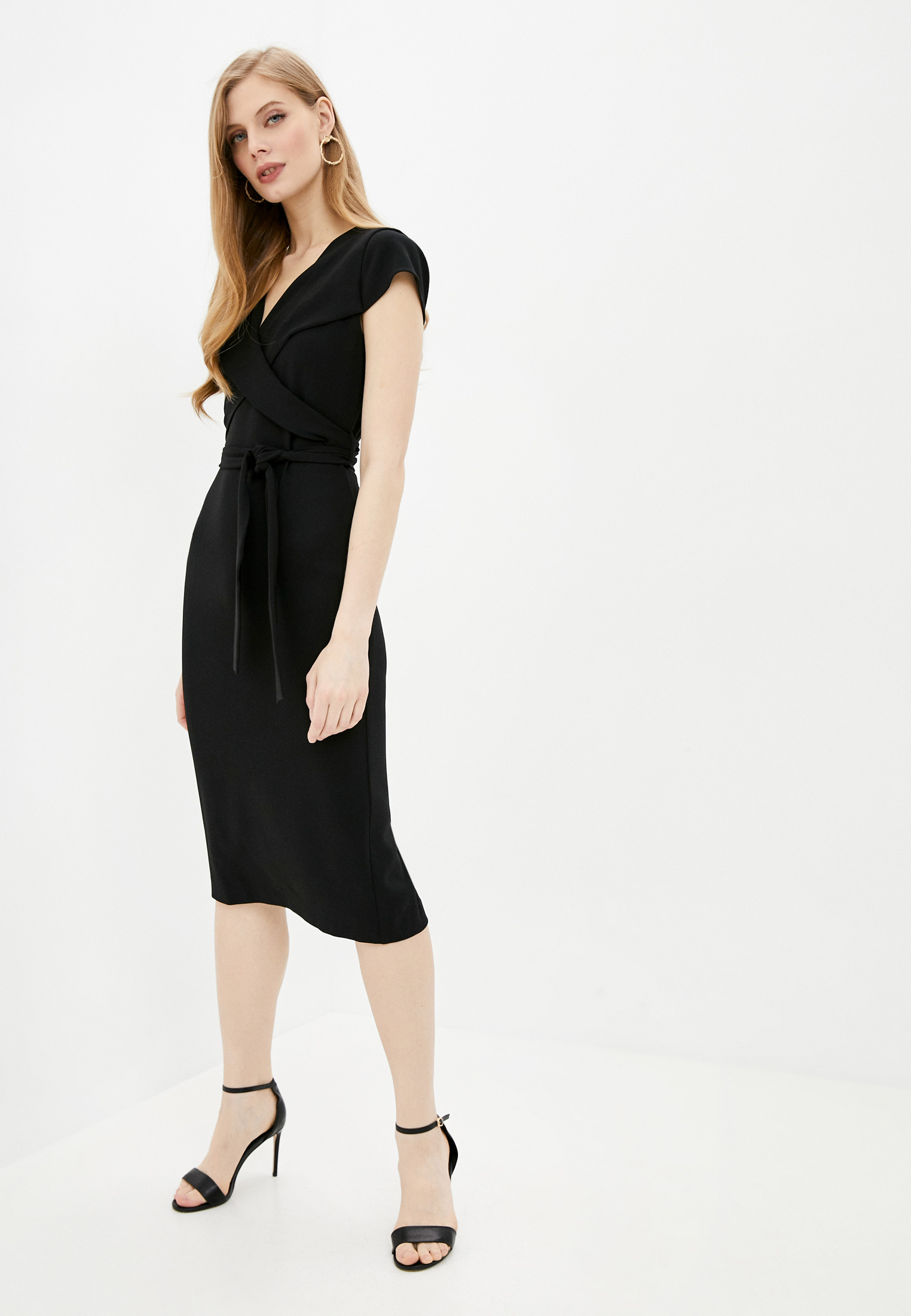 Черное платье из легкой вискозы от DIANE VON FURSTENBERG. -Крой модели повторяет изгибы тела, драпировки по всей длине разбавляют лаконичный дизайн, укороченные рукава длины 3/4, V-образный вырез декольте.