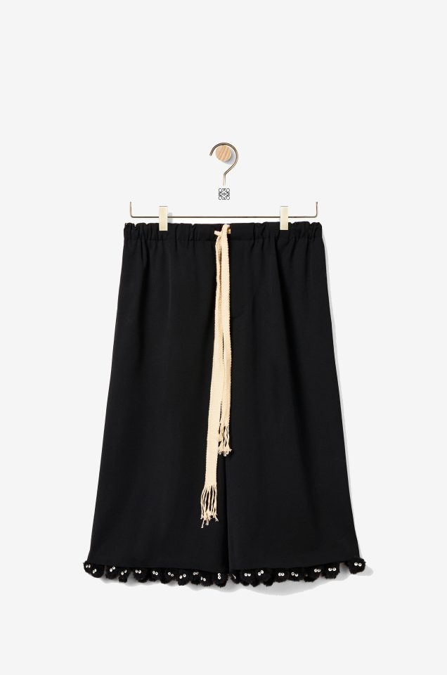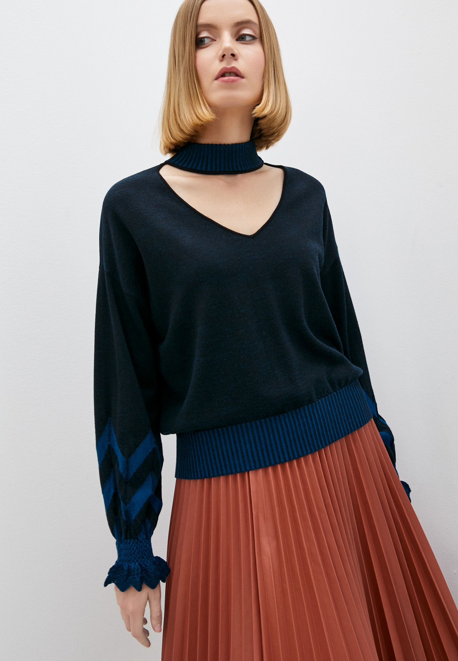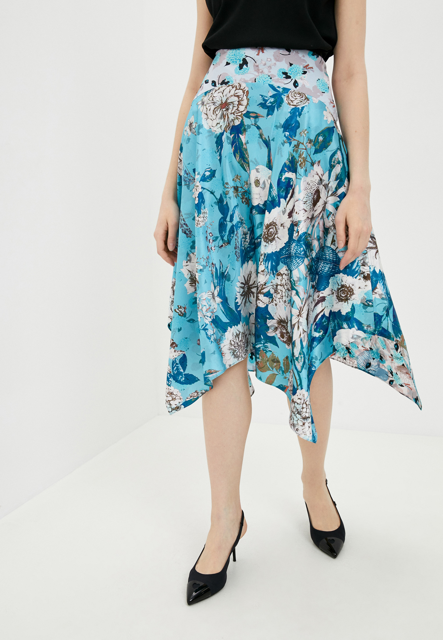 Черная юбка из осенне-зимней коллекции 2019 года станет удачным вложением в базовый гардероб. Синие вставки по бокам и пояс им в тон не снижают градус формальности, поэтому вещь не будет противоречить.