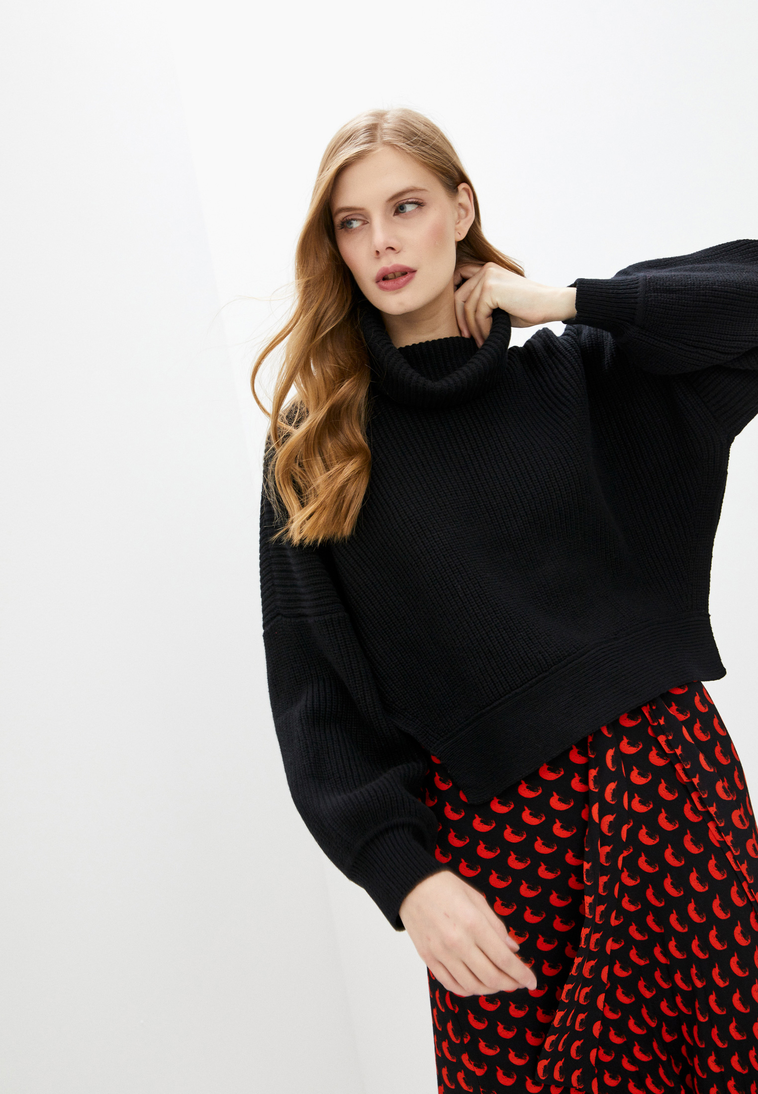 Трикотажный материал, детали с оборками, высокий воротник, объемные рукава и прямой подол.