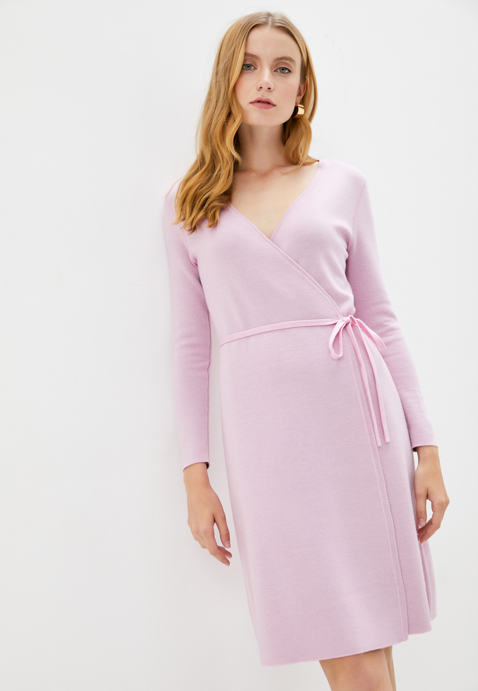 V-образный вырез, расклешенный крой, длинные рукава и длина миди.