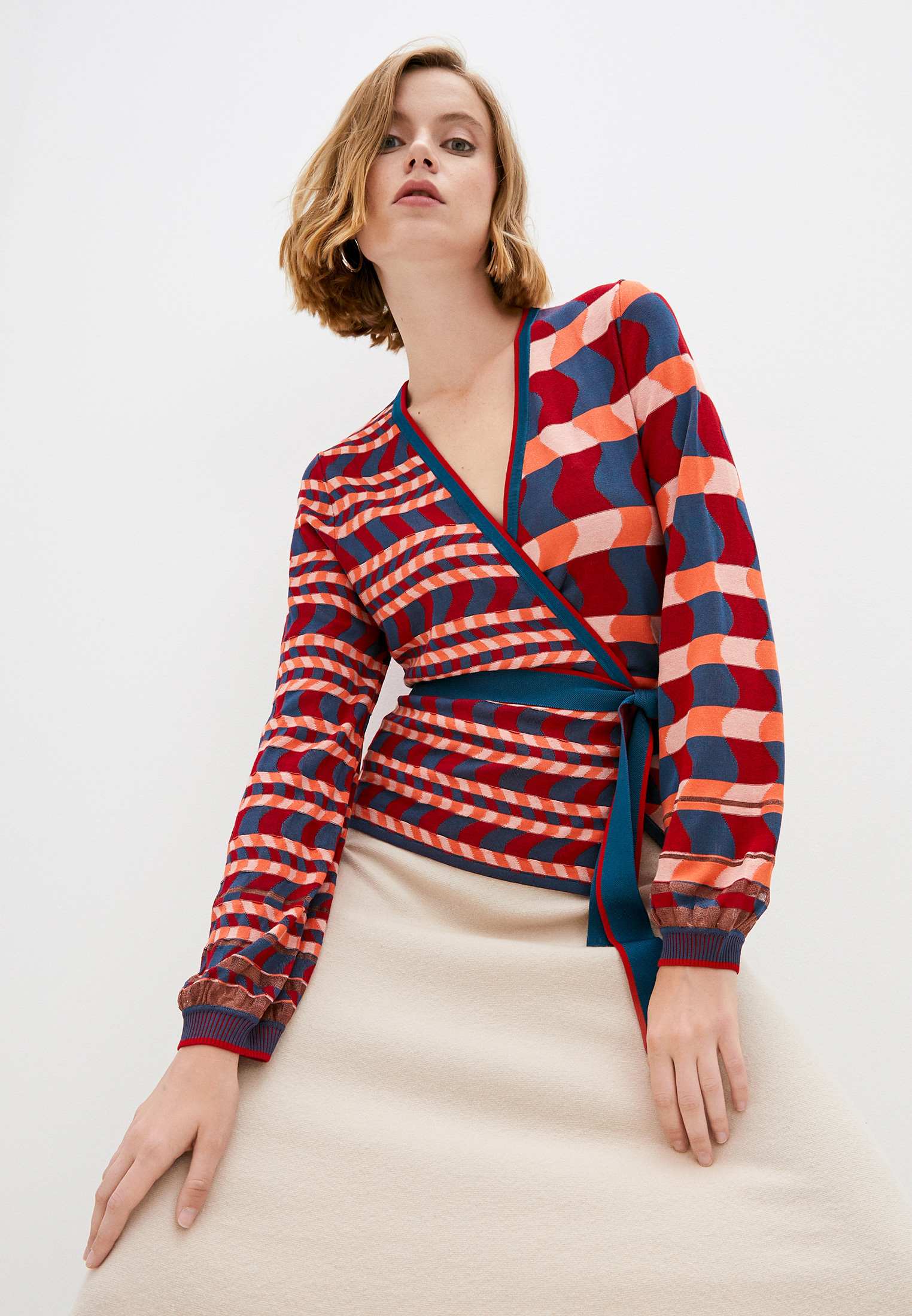 Трикотажный материал, жаккардовый материал с узором, V-образный вырез, юбка с запахом, кулиска на талии, длинные рукава, объемные рукава и длина миди.