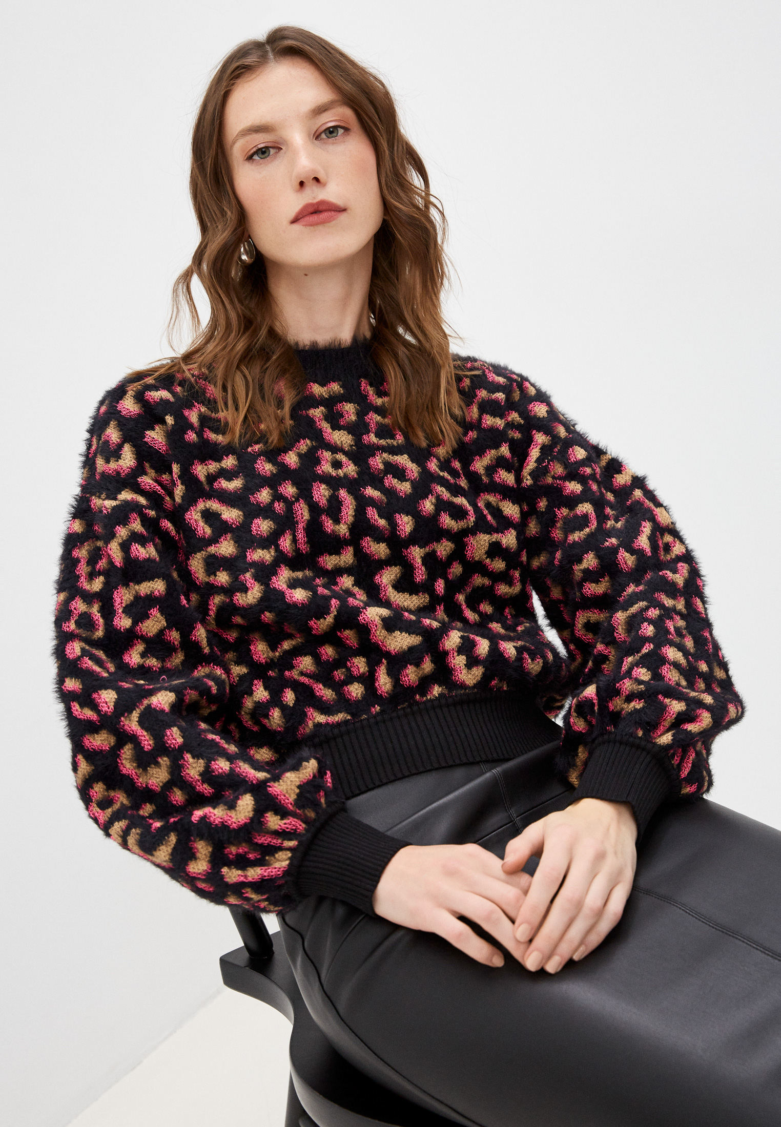 Жаккардовый материал с узором, леопардовый принт, круглый вырез, длинные рукава и прямой подол.