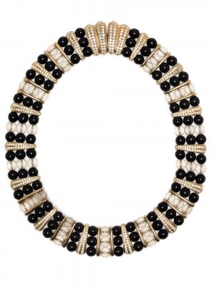 Чокер из ювелирного сплава от RUSHEV. Модель выполнена в виде половины наборной нити жемчуга и половины нити из страз, подвеска, застежка-карабин.