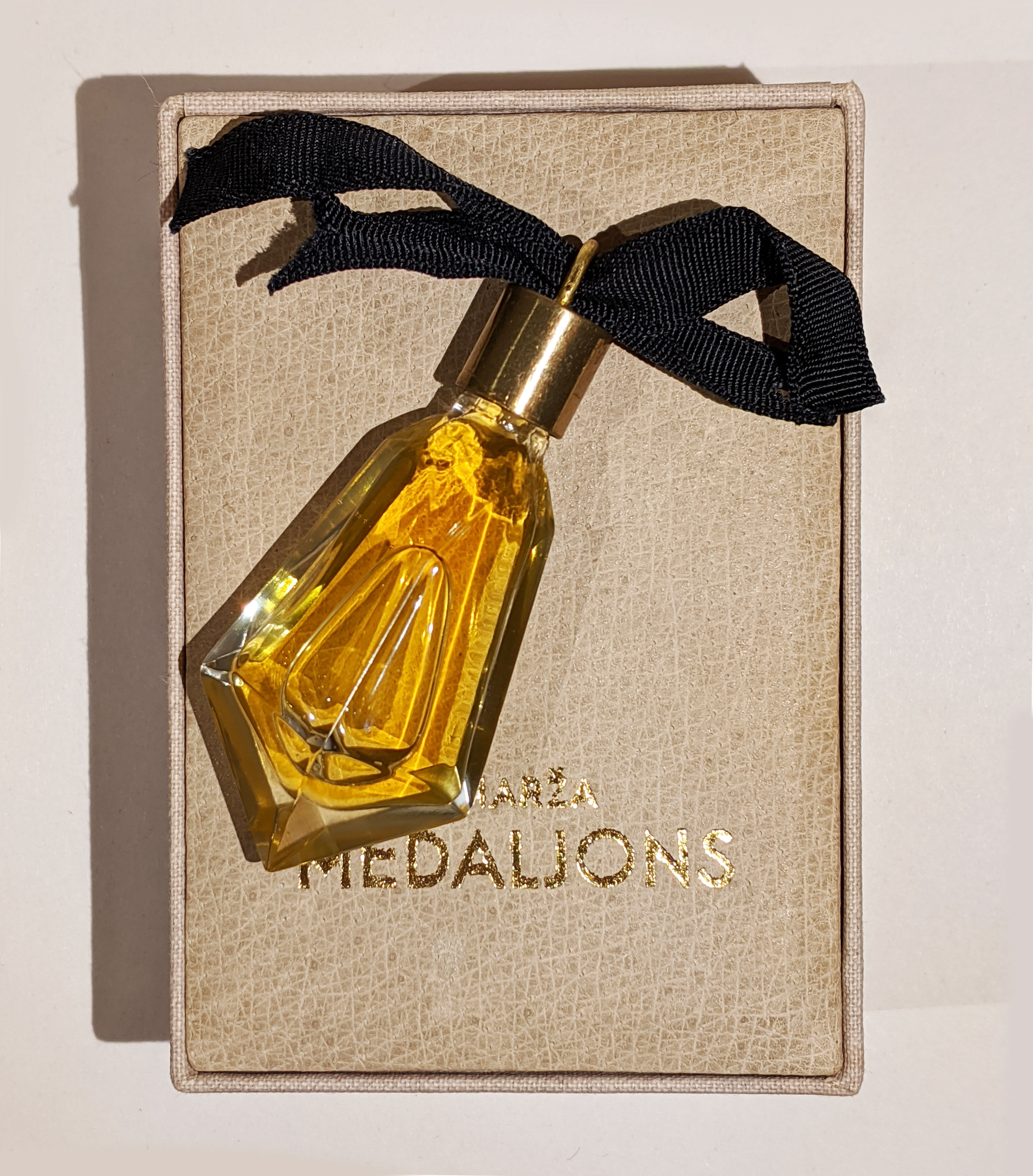 И еще один аромат в коллекции Дзинтарса был явно инспирирован контактом Брониславы Шварцман с миром моды в 1960–х – духи Medaljons, выпущенные в 1964 году. Их название почему-то переводилось на русский как “кулон”, но надо признать, что “Кулон” больше подходит для этого флакона, сделанного в виде ограненного кристалла.
