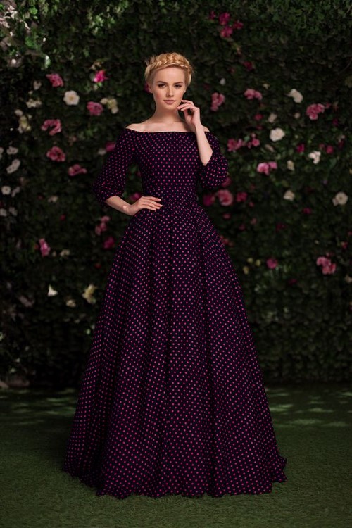 На фото мы видим чёрно-фиолетовое платье с горохом и необычным асимметричным покроем. Одна рука обнажена, другая – закутана в длинный рукав. Заметный акцент – широкий кожаный пояс, который перекликается с высокими чёрными сапогами. Прекрасный наряд для вечеринки.