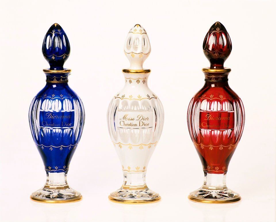 Для Dior компания Baccarat выпустила множество флаконов разнообразного дизайна — от амфор из цветного хрусталя по эскизу Фернана Гериколя до «обелиска» Diorama и строгого Miss Dior, украшенного рельефным принтом «пепита». Вершиной этого сотрудничества стал флакон Diorissimo, украшенный позолоченными цветами.