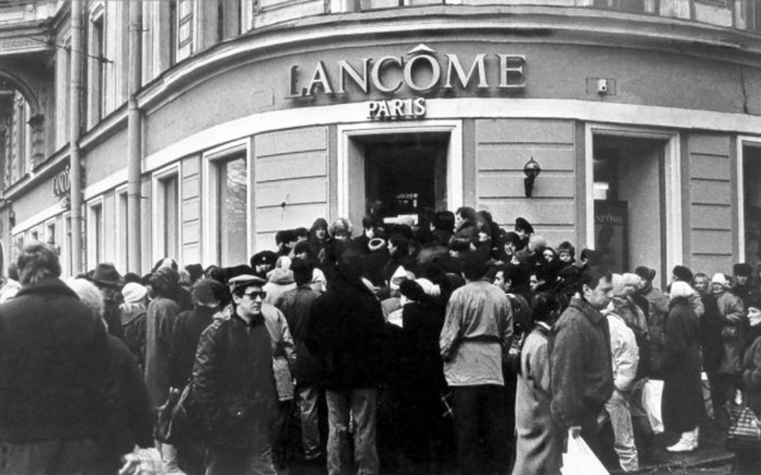 Ленинградцы осаждают открывшийся французский магазин Lancome, 1991 год