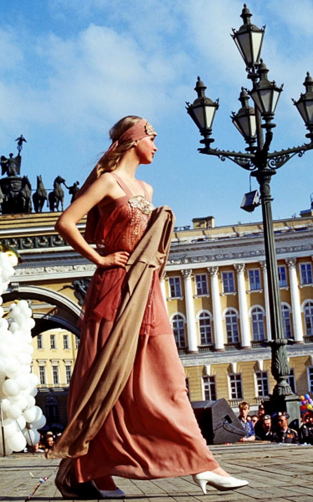 Показ моделей молодых петербургских стилистов на Дворцовой площади в дни празднования 292-й годовщины со дня основания города, 1995 год