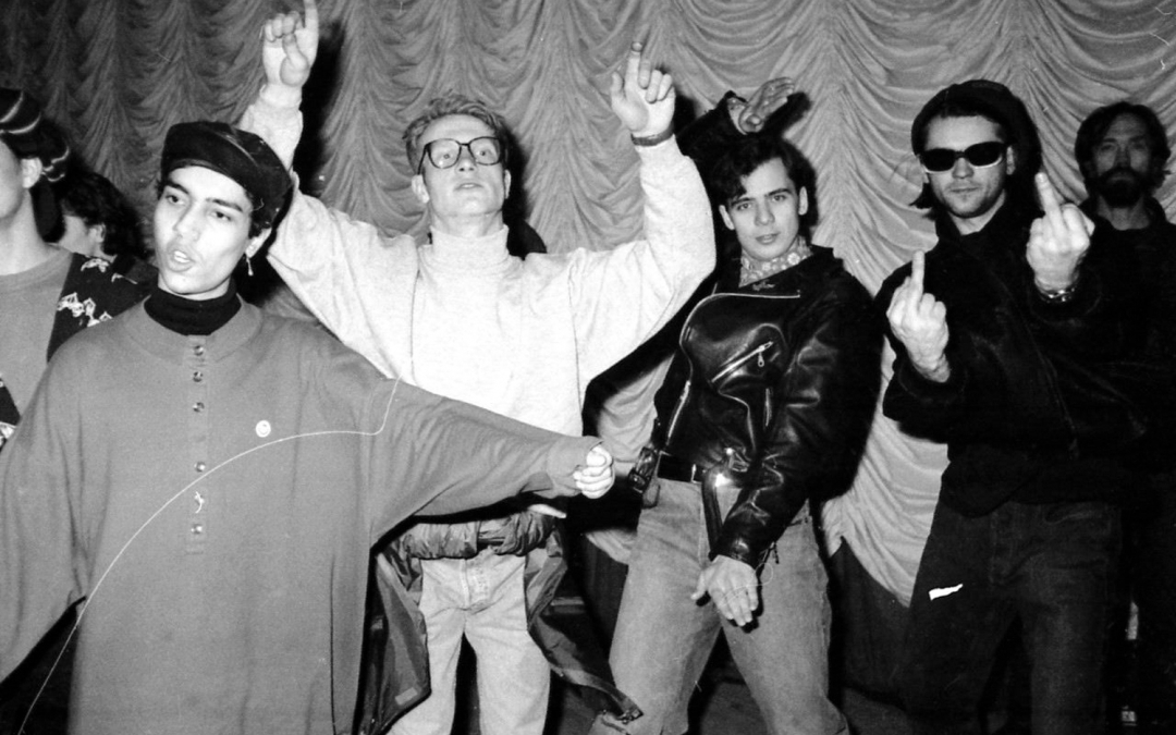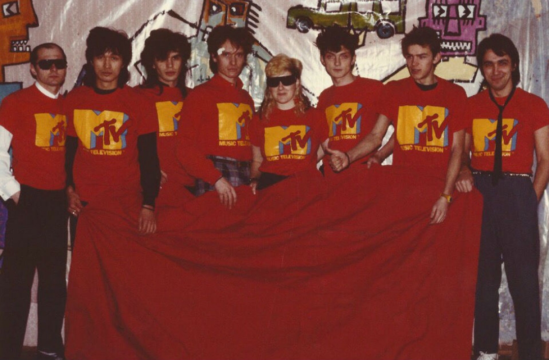 Сологуб, Цой, Каспарян, Гурьянов, Стингрей, Крисанов, Бугаев, Курехин в красных футболках MTV Music Television, привезенных в рекламных целях Джоанной Стингрей. © Joanna Stingray, 1986 год