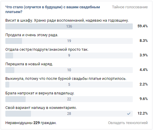 Интересно, что многим участницам опроса вообще не пришлось думать, что делать с платьем. Они просто отдали наряд туда, откуда брали, — в прокат.