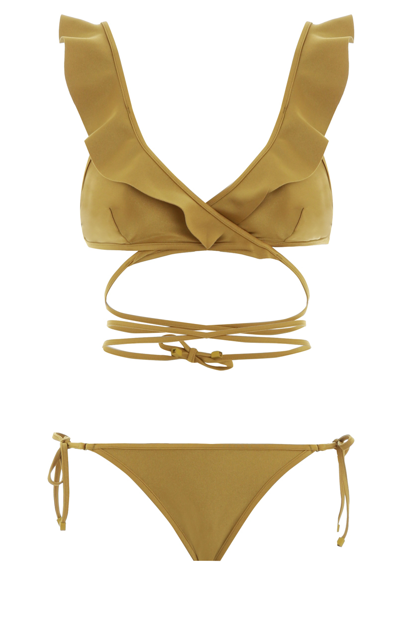 Бикини Suraya Frill с завязками спереди в благородном колере хаки с имитацией леопард входит в линейку Summer Swim 2019. Итальянского происхождения, изготовлено из лайкры, имеет деталь в виде оборки по всей линии декольте, вставные треугольные чашки и плавки с высокой посадкой, бретели можно отрегулировать под необходимый размер с помощью завязок.