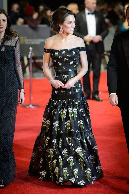 13. Немного ретро — Кейт Миддлтон и принц Уильям на красной дорожке церемонии BAFTA-2017. Герцогиня в черном атласном платье Alexander McQueen с открытыми плечами. Нежные набивные цветы на черном атласе в сочетании с необычным лифом добавили образу Кейт элегантности и романтичности.