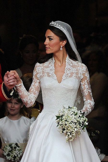 Наряд Кейт для столь значительного события создавала британский дизайнер Сара Бертон, креативный директор Alexander McQueen. У потрясающего платья была объемная юбка, кружевные рукава и невероятный шлейф длиной почти 3 м. Бертон объяснила, что в дизайне платья присутствуют отсылки и к викторианской эпохе, и к современному искусству.