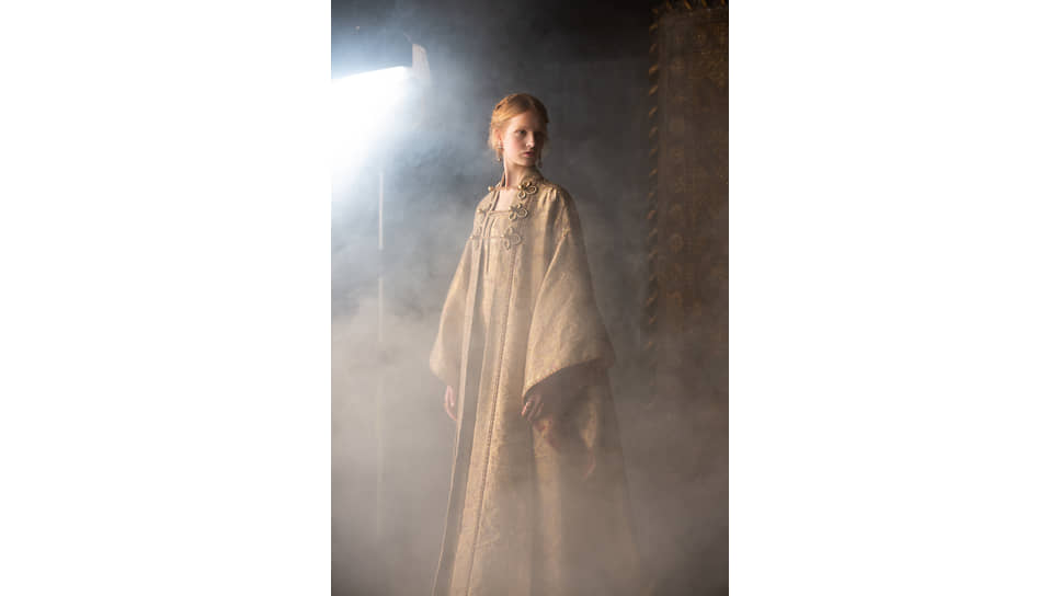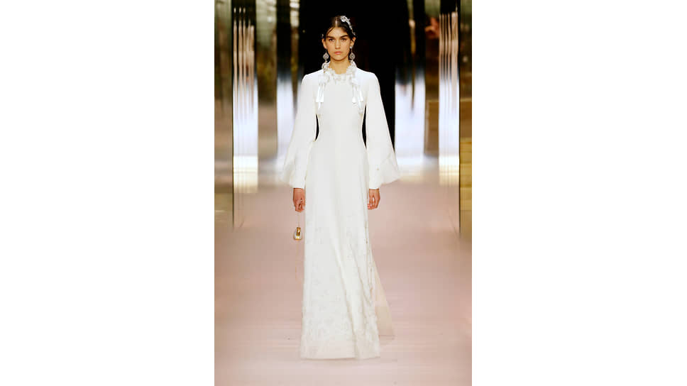 Завершил показ свадебный образ: невеста, будто сошедшая с фотографий 20-х годов, появилась перед зрителями на белом коне. Лаконичное белое платье с воротником-стойкой, манжетами и шлейфом выполнено из атласного крепа и расшито стразами и жемчужными бабочками. Образ дополнила длинная фата, которая не могла оставить никого равнодушным.