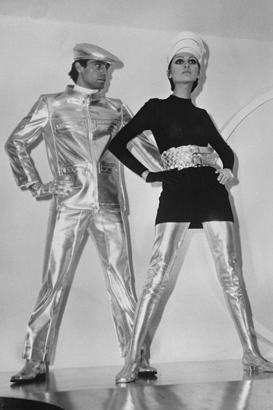 Эстетику моды космической эры с ее белыми и металлического цвета костюмами, стилизованными под скафандр, шляпами, напоминающими шлем, комбинезонами, мини-платьями и обувью на плоской подошве сформировали Пьер Карден, Андре Курреж и Пако Рабан.