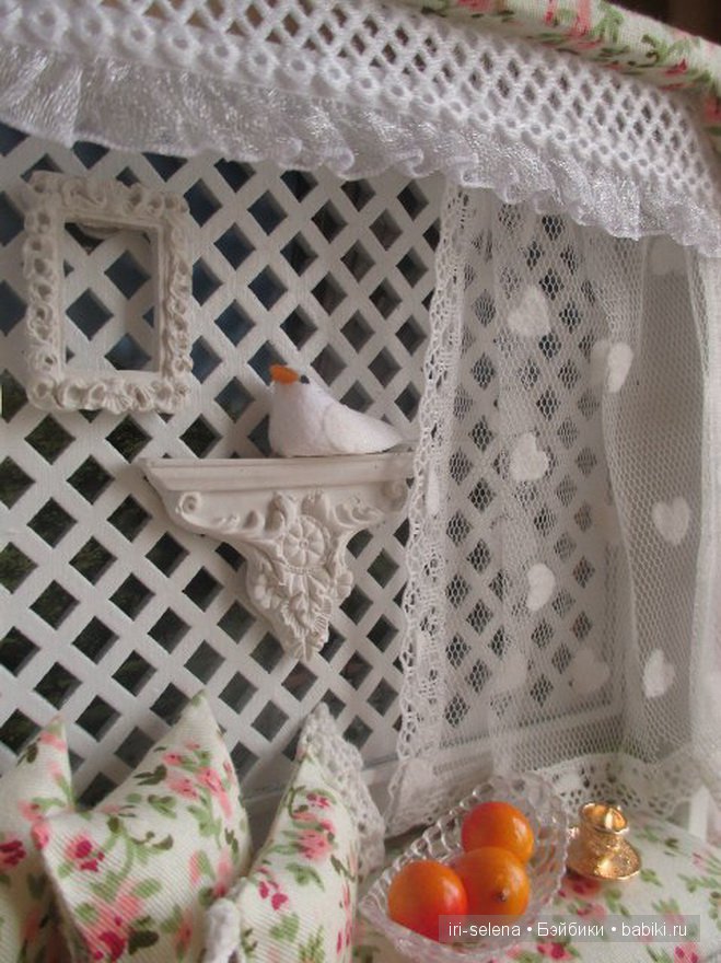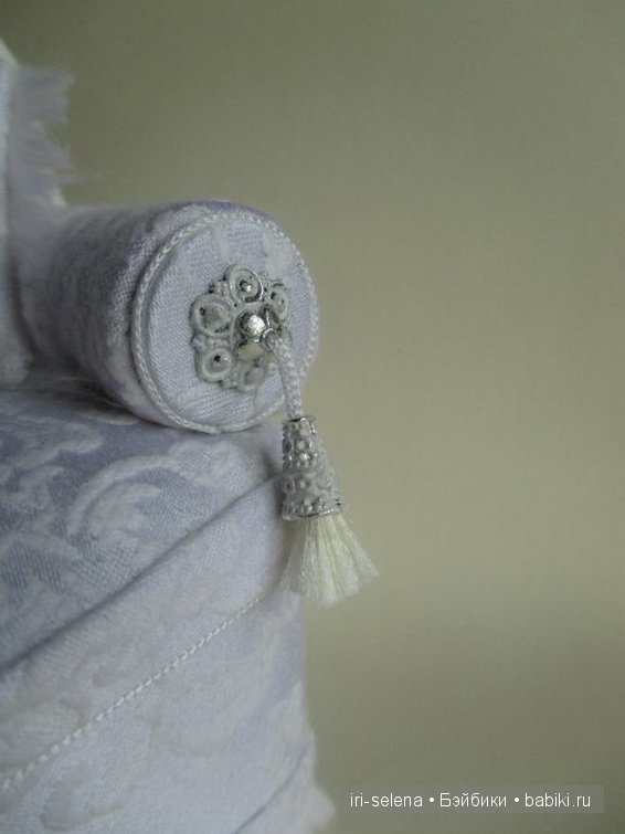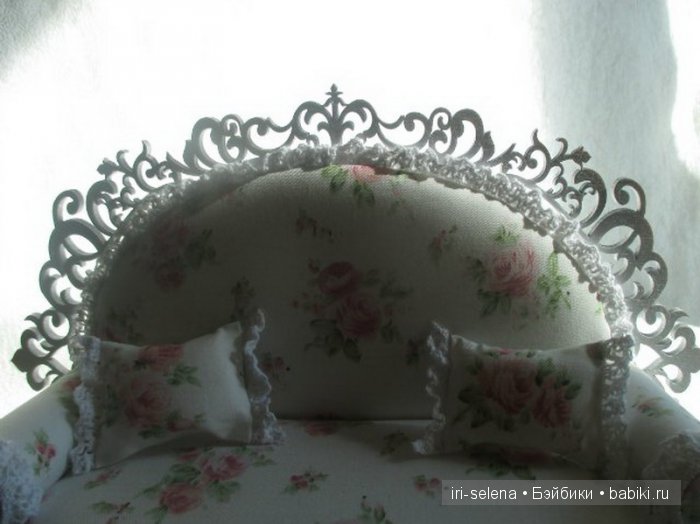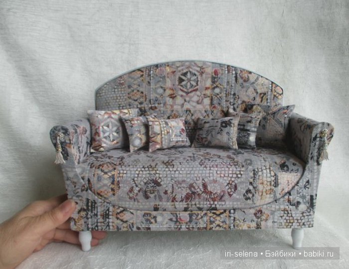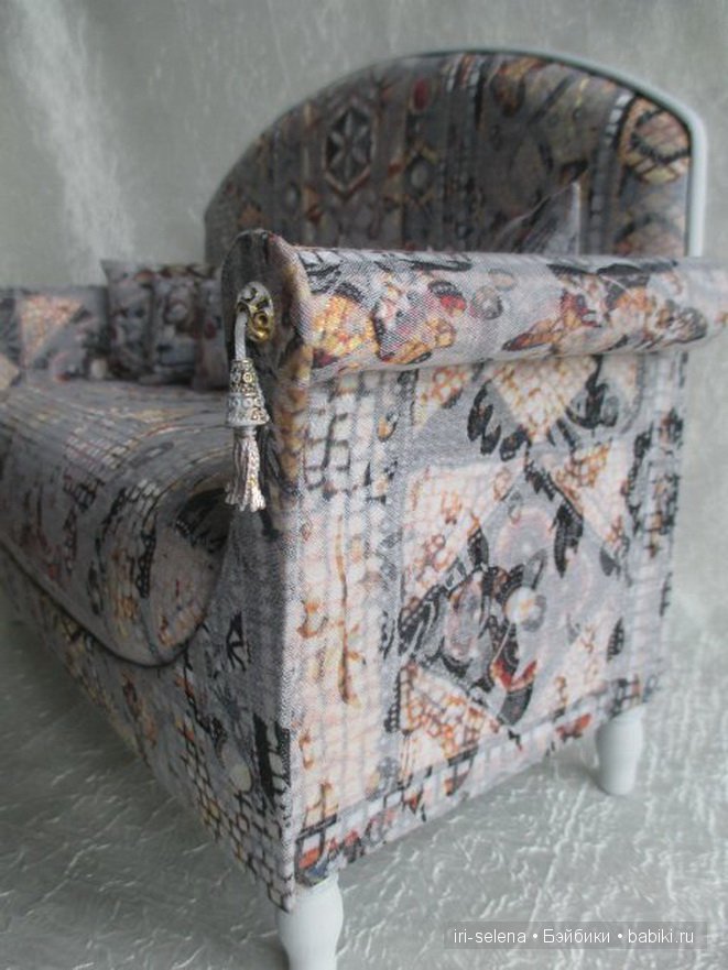 Выкроить в виде арки, по размеру чуть ниже боковин и приклеить клеем “титан” на передний вид боковин закрывая при том швы. Дополняем нашу мебель покрывалом и диванными подушечками.