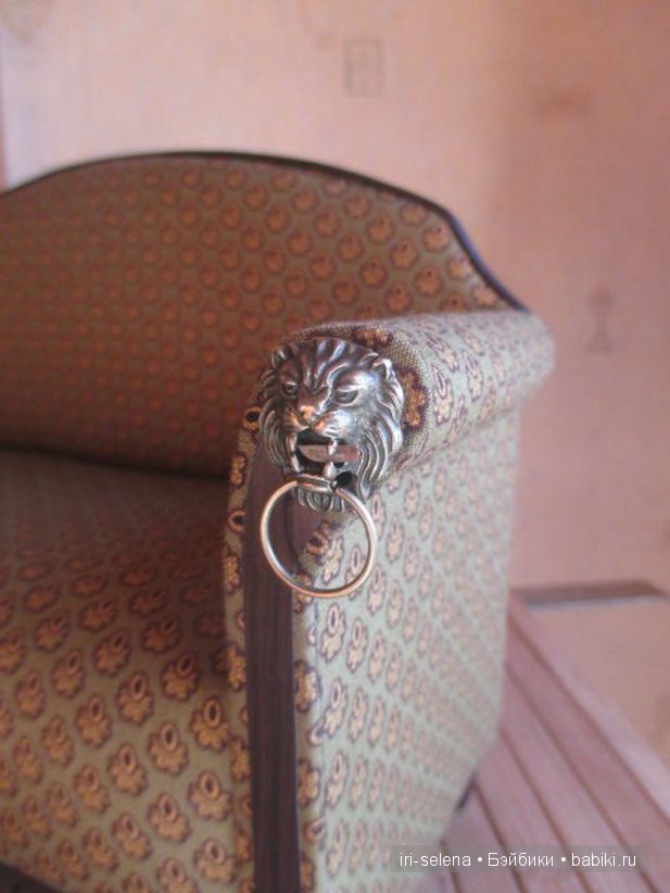 Обивка дивана посложнее: сшитая по выкройкам с тесьмой и декоративными пуговками (можно с заклепками, — и то, и то можно обтягивать тканью, если позволяют общие масштабы)