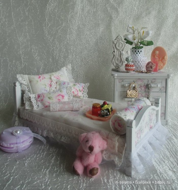 - Размер кровати: длина 20 см, ширина 10 см, высота изголовья 10 см, высота изножья 8 см.