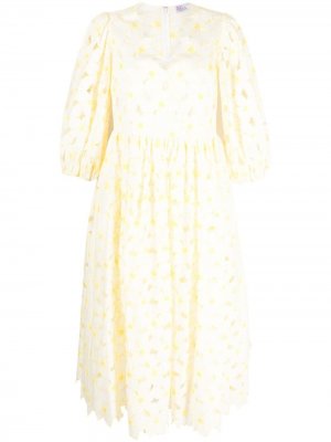 Вырезные детали в форме цветов, V-образный вырез, пышные рукава три четверти, потайная застежка на молнии сзади и длина до середины икры.