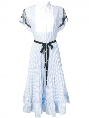 Платье-рубашка в полоску от REDValentino (Ред Валентино). Заостренный воротник, планка на пуговицах спереди, короткие рукава, кружевная вставка, талия на завязке, расклешенная юбка и подол с рюшами.