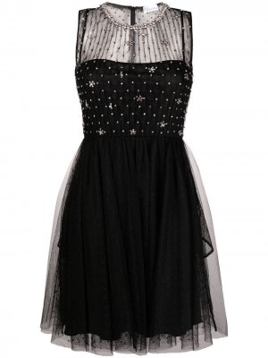 Длинное платье из тюля с цветочным принтом от REDValentino (Ред Валентино). Украшение из бусин, круглый вырез под горло, застежка на молнии сзади, модель без рукавов, талия на завязке, расклешенная юбка.