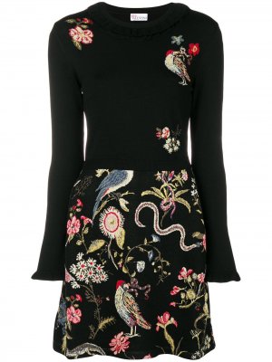 Элегантное женское платье от REDValentino создано из гладкой вискозы stretch. Модель в глубоком черном цвете украшена вставкой из полупрозрачного тюля с культовым мотивом «пуэн-деспри». Высокий разрез.