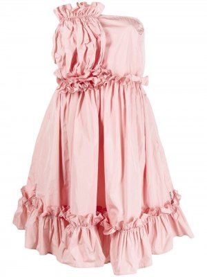 Вставки с оборками, без бретелей, потайная застежка на молнии сзади, два прорезных кармана по бокам и расклешенный крой.
