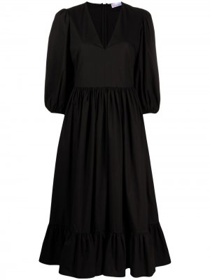 V-образный вырез, пышные рукава три четверти, застежка на молнии сзади и подол с оборками. Цвет: черный.