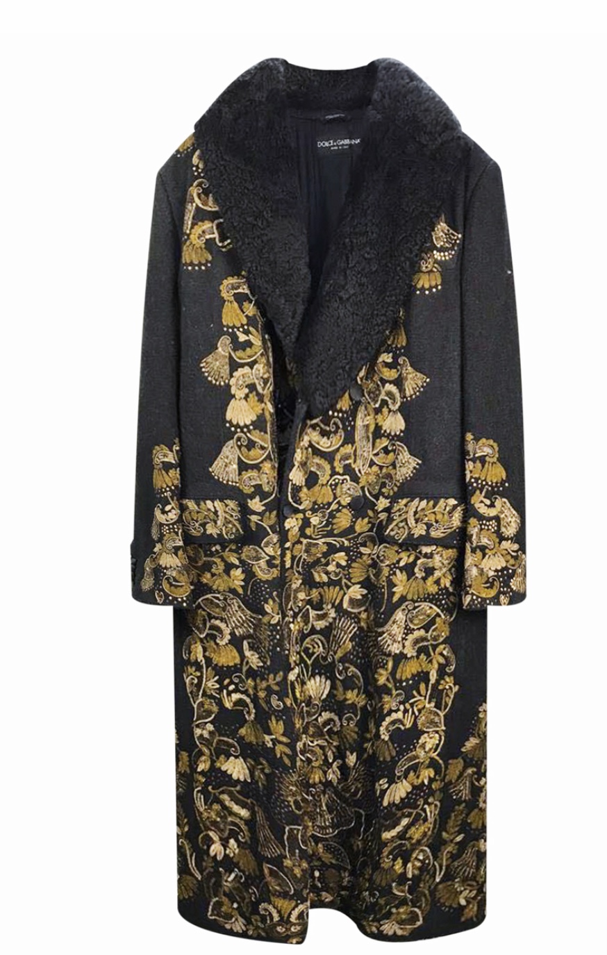 – Американский социолог Герберт Блумер выделял 7 функций моды. Одна из них – вызывающая зависть демаркация высших классов. Иначе говоря, одежда демонстрирует богатство. Так вот это пальто «Dolce&Gabbana» буквально кричит о своей баснословной цене. Не сомневаюсь, что в таком пальто Филипп был бы видным гостем и на приёме Людовика XIV, который питал большую страсть к ярким представлениям и дорогим нарядам. Отделка вышивкой, пайетки и золотистый стеклярус – всё придаёт творению итальянских кутюрье помпезный вид. Носить это пальто стоит с вещами попроще, хотя обувь и головной убор могут повторять его декор. Так композиция будет более сложной и вместе с тем гармоничной.