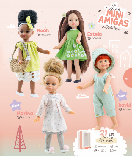 В коллекции малышек Паола Рейна 21 см появились две новые куклы – мальчик и девочка. Давид – веселый рыжий мальчишка в песочнике и панамке. Марина в белом платье с оборками и балетками с розовыми помпончиками. Головку украшает изящный пушистый хвостик.