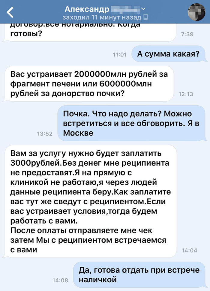 – Вам за услугу нужно будет заплатить 3000 рублей. Без денег мне реципиента не предоставят. Как заплатите, вас тут же сведут с реципиентом. Если вас устраивают условия, тогда будем работать с вами. После оплаты отправляете мне чек.