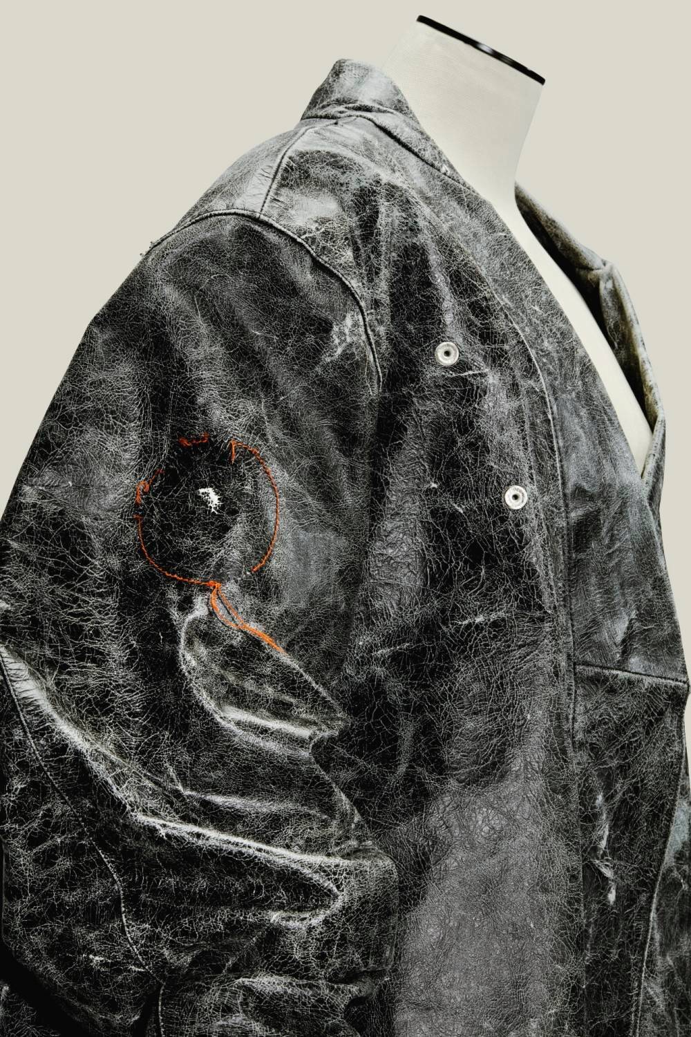 Байкерская куртка была такой же огромной — размера XXXL. Покоцанные места на потертой коже не прятались, а наоборот, акцентировались.