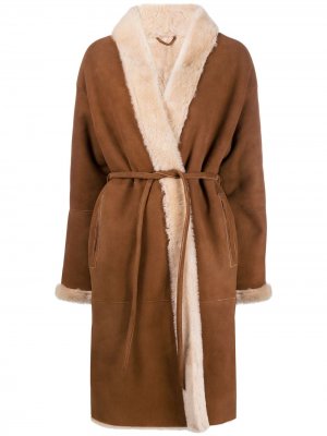 Пальто с леопардовым принтом от Simonetta Ravizza. Средней длины, ремень на талии и V-образная горловина. Цвет: коричневый. размер:40|материал:Овчина, Полиэстер, Замша|цвет:Коричневый|пол:Женский