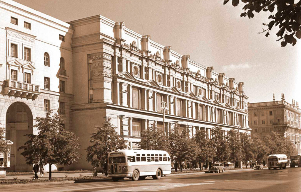 «В подражание павильону Сибири на ВСХВ архитектор Гегарт запроектировал здание телевизионного центра с громоздкими колоннами, скульптурами, парапетом и венчающим карнизом». Правда, проект здания к тому времени упростили донельзя. Кстати, и дату 23 ноября 1955 года запомните: фактически ее можно считать официальным днем похорон true минского сталинского ампира.