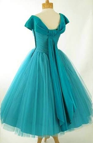 Скромная длина пышной юбки, декольте, без рукавов или совсем короткие рукава. Иногда платье было с открытыми плечами, в качестве дополнения в этом случае использовался жакет-болеро, а само платье использовалось на любые вечеринки, его можно было надеть в театр, на танцы, пойти в гости. Платье по-настоящему можно назвать уникальным. Девушки любили его за то, что в нем они были, как дамы, а дамы – за то, что в нем они становились моложе лет на десять.