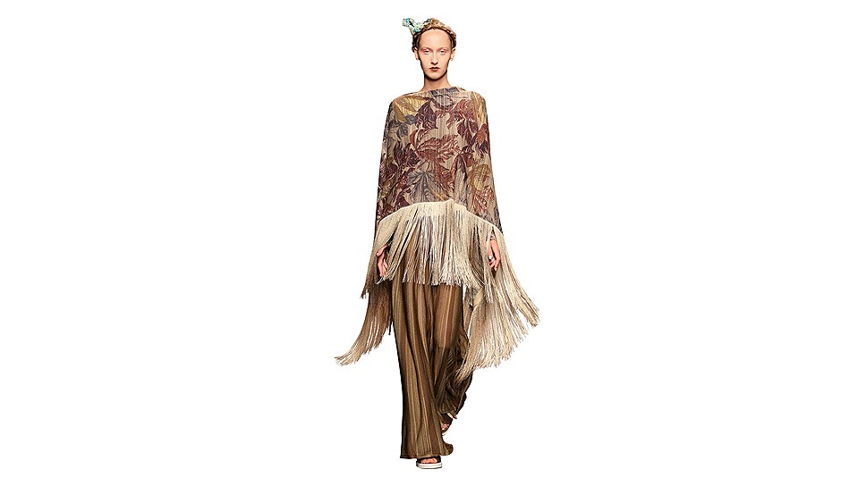 Богатая, но словно присыпанная пылью времени палитра, орнаментированные вышивкой и пайетками тиары в волосах и выразительные пропорции с подчеркнутыми широкими ремнями точеными талиями и пышными юбками задают настроение коллекции. Ее основу составляют фирменные маррасовские платья с фартуками, напоминающие о странствующих монахах-дервишах сочетания легких пальто и шортов, струящиеся платья-туники, свободные укороченные брюки, жакеты и джемперы оверсайз. Металлизированная тафта, выбеленные льны, радужный стрейч-шантунг, органза, креп, льняной твид, струящиеся шифоны, жаккард, английская вышивка, ришелье, макраме, ламинированная кожа — все эти ткани и отделки сочетаются по принципу схожести или контраста. За немногим исключением, коллекция выглядит легкой и очень удобной, но каждая вещь сделана так, что затеряться в ней в толпе будет очень непросто. Интерпретация веры Марраса в неординарность оборачивается верой в силу характера и чувство стиля или — близорукость, дарящую счастливый покой неведения о количестве глазеющих на вас зевак.