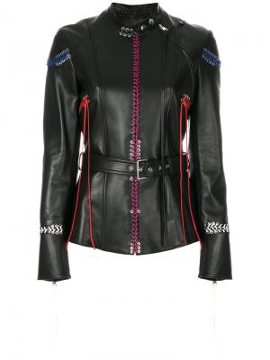 Черная куртка из кожи ягненка и шелка с декоративной прошивкой от Alexander McQueen(Александр Маккуин). Воротник на пуговицах, застежка на молнии сбоку, ремень на талии, манжеты на молнии, приталенный.