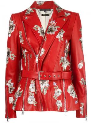 Красная байкерская куртка с цветочной вышивкой из кожи ягненка и шелка от Alexander McQueen(Александр Маккуин). Заостренные лацканы, смещенная застежка на молнии, пояс на талии, длинные рукава, манжеты.