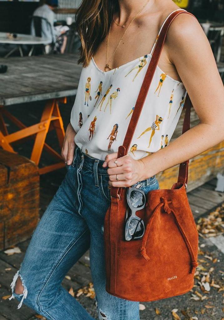 Летом сочетайте замшевую сумку с вещами контрастной текстуры: грубыми джинсами, нежными шелковыми топами и платьями. В холодный период аксессуар подружится с мягкими джемперами из шерсти.
