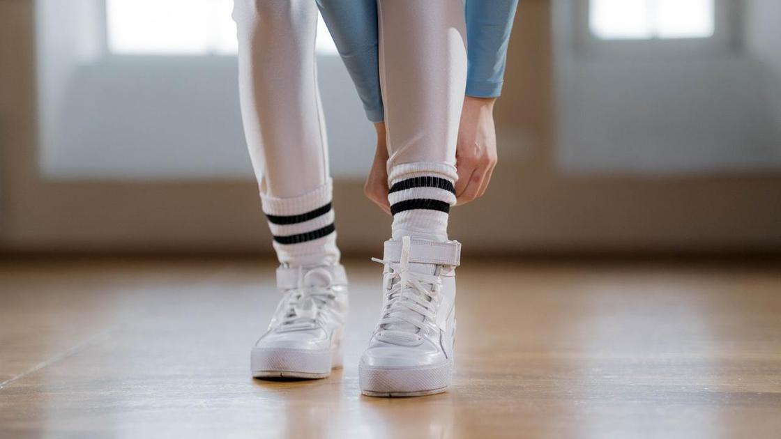Однако обувь до щиколотки имеет коварную особенность: обладательницам небольшого роста такие кроссовки визуально укоротят длину ног. В таком случае выбирайте светлые модели, а лучше — пару на толстой подошве, которая приподнимет стопу.