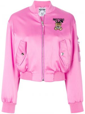 Розовая куртка-бомбер ‘Playboy Toy Bear ‘ из хлопкового микса от Moschino(Москино). Ворот в рубчик, длинные рукава, застежка на молнии, укороченная длина.